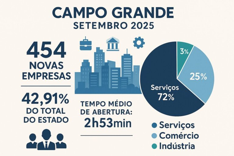 O setor de Serviços lidera com 72,2% das novas empresas, seguido por Comércio (25,1%) e Indústria (2,6%). De janeiro a setembro, Mato Grosso do Sul registrou 10.248 novas empresas, das quais cerca de 4.400 foram abertas em Campo Grande, consolidando a cidade como o principal centro de empreendedorismo do Estado e um dos mais dinâmicos do Centro-Oeste.