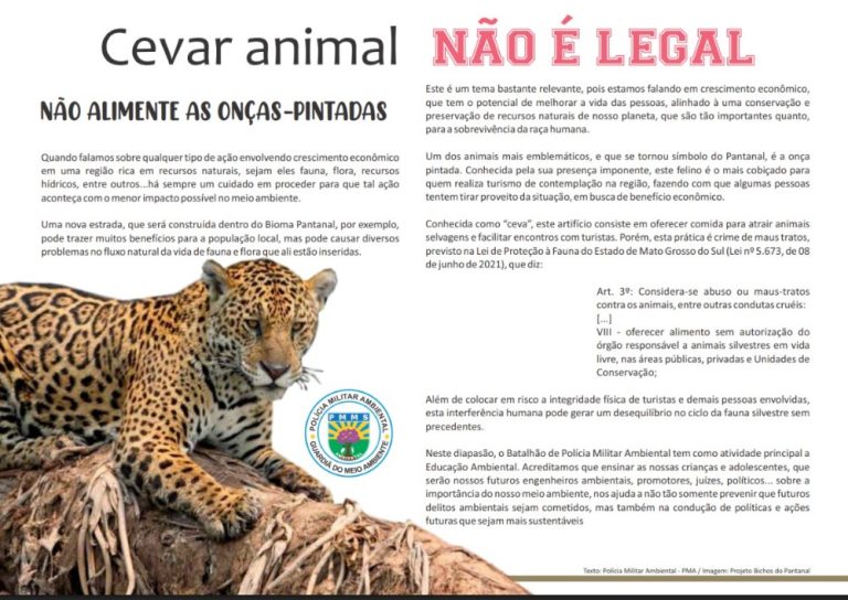 Com objetivo de levar orientação à população sobre animais silvestres, a PMA (Polícia Militar Ambiental) realiza uma série de ações, campanhas e até expedições para conscientizar ribeirinhos, pantaneiros e turistas sobre esta convivência e que práticas são consideradas ilegais.