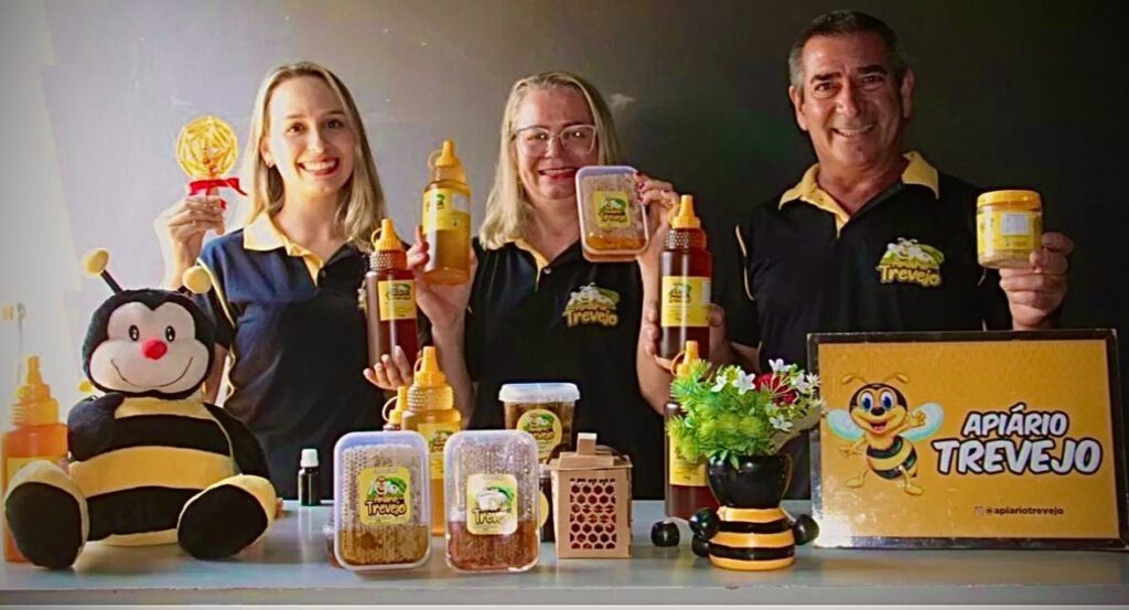 Para conhecer os produtos do Apiário Trevejo, basta acessar o Instagram @apiariotrevejo, onde há atualização das agendas de feiras, catálogo de produtos e a rotina de trabalho da equipe formada pela família junto às operárias abelhas.