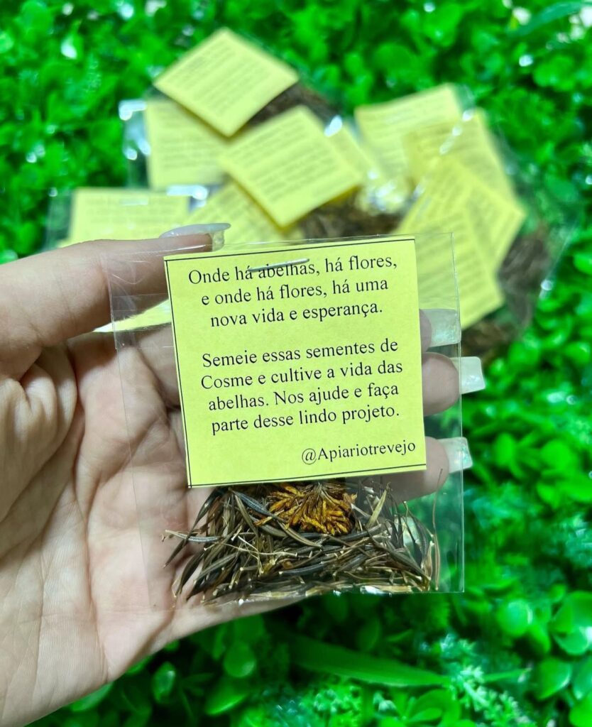 Durante as vendas dos produtos, os empresários distribuem aos clientes sementes de Cósmea, uma planta conhecida por atrair abelhas, borboletas e outros polinizadores, contribuindo, assim, para a biodiversidade.