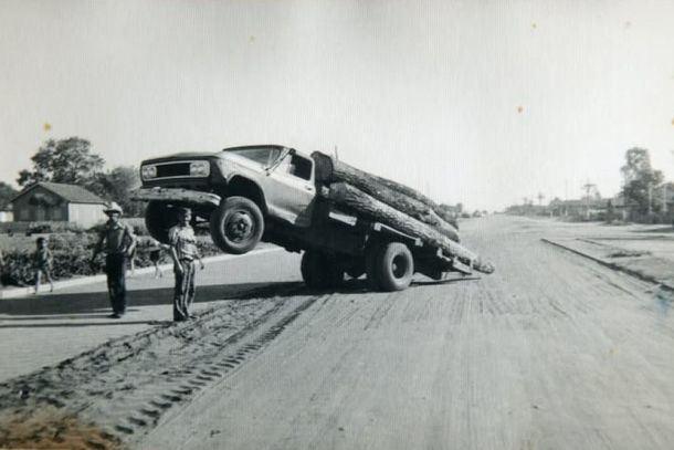 Até meados dos anos 1980, as ruas ainda não eram divididas pelo canteiro central que existe atualmente. Era comum ver diariamente caminhões transportando cargas de madeira que, muitas vezes, aparentavam ser maiores e mais pesadas que o próprio veículo. Na foto, dois homens observam a cena sorrindo, enquanto crianças ao canto esquerdo parecem passar assustadas — retrato típico da rotina vivida por muitos moradores naquela época.