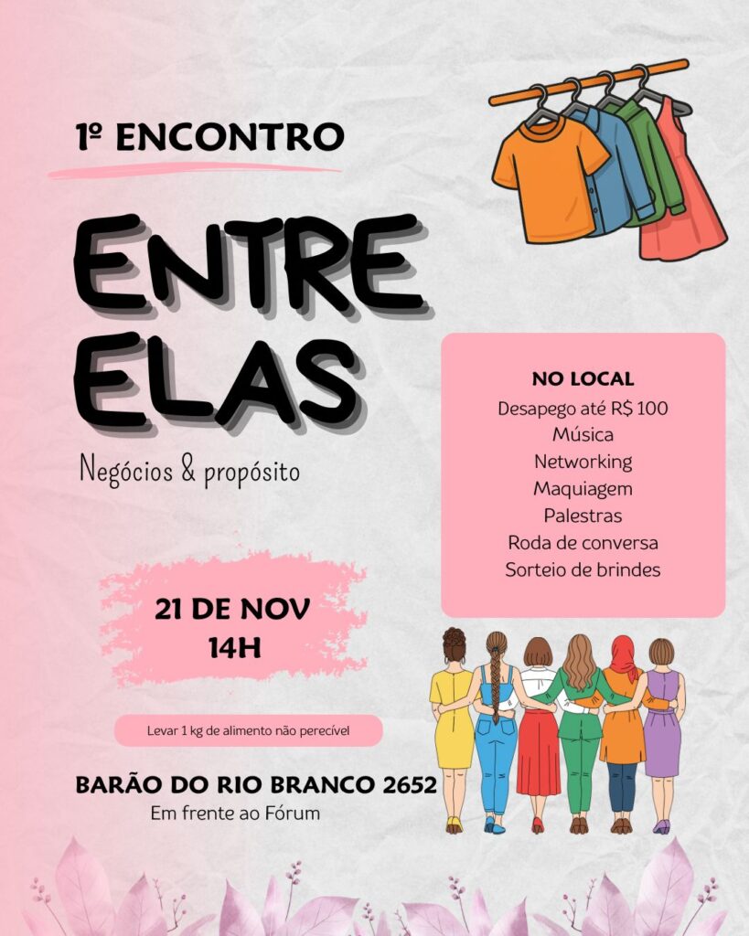 O 1º Encontro “Entre Elas – Negócio & Propósito”, promete ser um marco para mulheres que buscam ampliar sua rede de contatos, fortalecer seus negócios e reafirmar o seu propósito. A iniciativa é totalmente beneficente, com entrada de 1 kg de alimento não perecível, cuja arrecadação será destinada ao Projeto Nova, que atende crianças vítimas de violência.