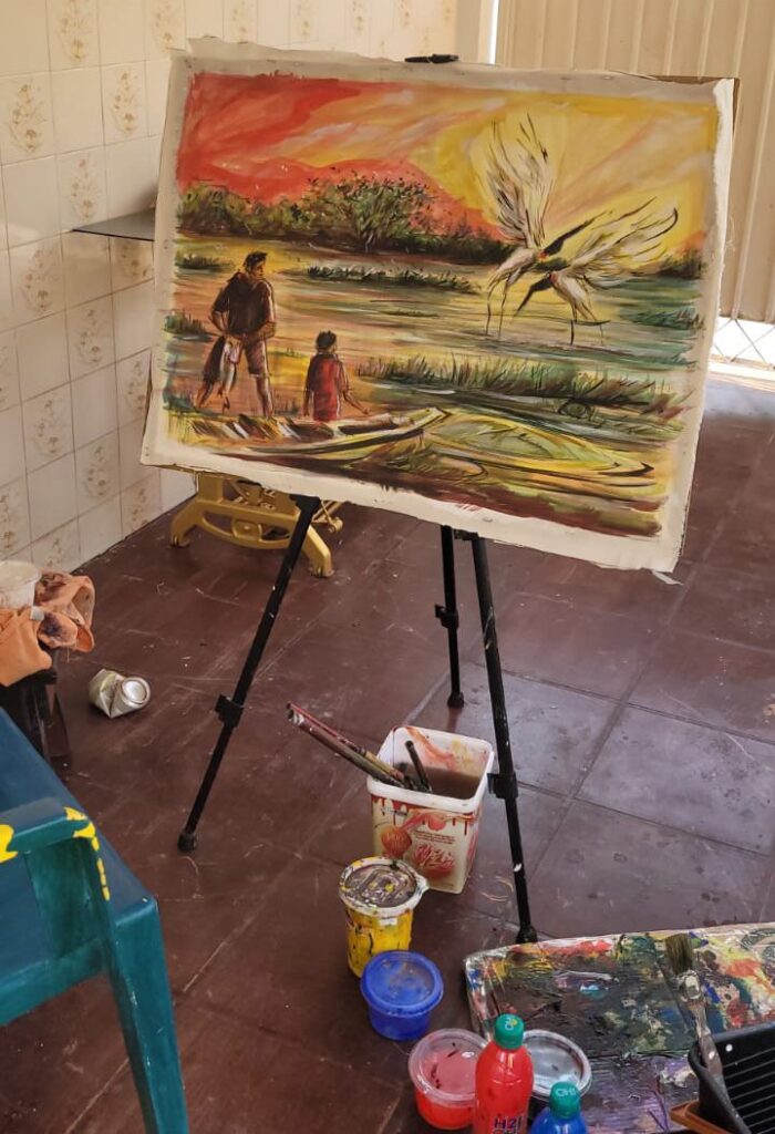 Na varanda, onde o vento sopra histórias e o sol desenha o horizonte em tons de ouro, vive e cria Epaminondas Daltro, um artista que transforma o cotidiano do Pantanal em poesia pintada. Seu estúdio não tem paredes fechadas: é a varanda aberta para o mundo, de onde se vê o vaivém das águas, o voo das garças e o silêncio profundo da planície alagada.