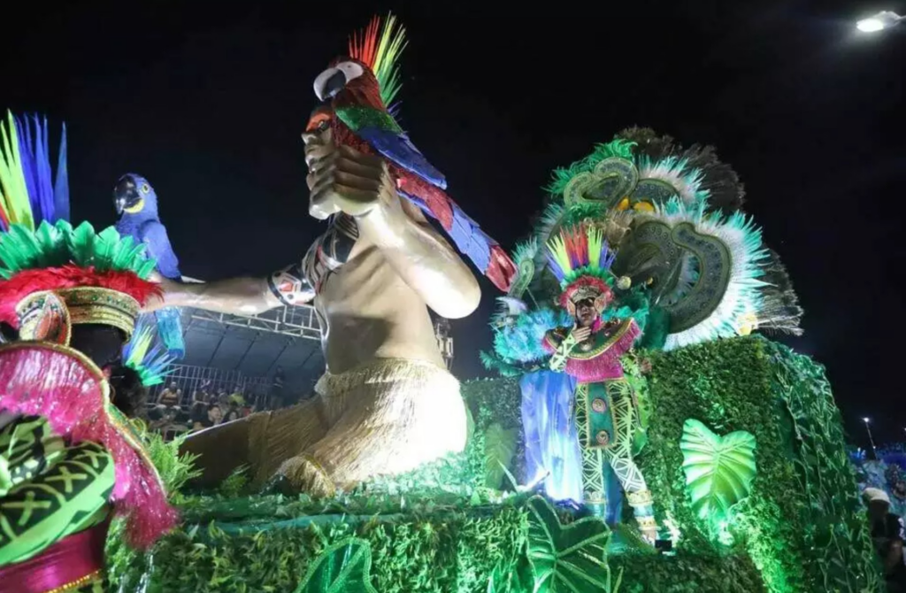 Na avenida, a Vila Carvalho apresentou um espetáculo com forte abordagem ambiental. O enredo trouxe a arara-azul, símbolo do Pantanal sul-mato-grossense, como protagonista de uma narrativa que conectou o bioma à realidade da Amazônia.