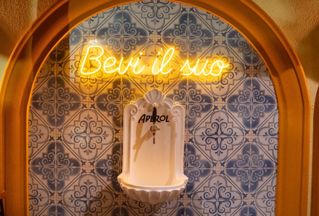 Um dos grandes diferenciais da casa é a fonte exclusiva de Aperol Spritz, servida diretamente da torneira. A peça se inspira nas fontes de água da Itália do período do Império Romano, transformando o ato de servir o drink em parte essencial da experiência.