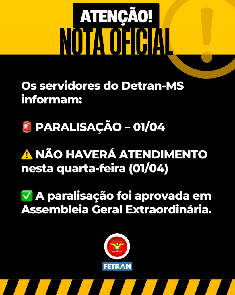 O Sindicato dos Servidores do Departamento Estadual de Trânsito de Mato Grosso do Sul (SINDETRAN-MS) informa que, conforme deliberação em Assembleia Geral Extraordinária, a categoria realizará paralisação de advertência de 24 horas no dia 1º de abril de 2026.